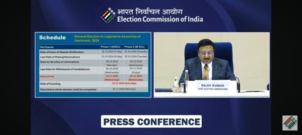 सेंट्रल डेस्क। Jharkhand Election: झारखंड में चुनाव आयोग ने चुनावी तारीखों की घोषणा कर दी है। इसके साथ ही राज्य में चुनावी बिगुल बज गया है और आदर्श आचार संहिता लागू हो गई है। झारखंड में विधानसभा की 81 सीटों पर चुनाव होने है। हेमंत सोरेन सरकार का कार्यकाल 5 जनवरी 2025 में समाप्त हो रहा है।