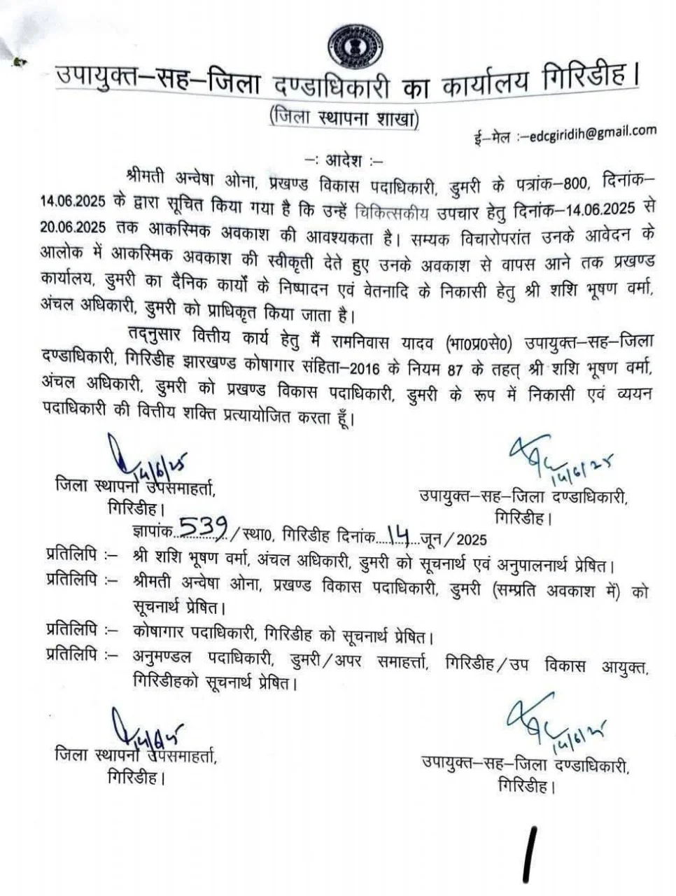 गिरिडीह जिला प्रशासन ने उनके अवकाश को स्वीकृत करते हुए शशि भूषण वर्मा, अंचल अधिकारी डुमरी को डुमरी बीडीओ का अतिरिक्त प्रभार सौंपा है। इस संबंध में उपायुक्त-सह-जिला दंडाधिकारी, गिरिडीह कार्यालय द्वारा आदेश जारी किया गया है।