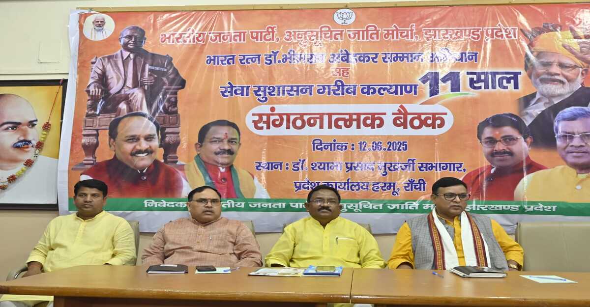 RANCHI (JHARKHAND): भारतीय जनता पार्टी के सेवा, सुशासन और गरीब कल्याण के 11 वर्षों की उपलब्धियों को समर्पित एक विशेष संगठनात्मक बैठक गुरुवार को भाजपा प्रदेश कार्यालय रांची में हुई। इस अवसर पर डॉ. भीमराव अंबेडकर सम्मान अभियान और प्रधानमंत्री नरेंद्र मोदी के नेतृत्व में पार्टी की उपलब्धियों पर चर्चा की गई। मुख्य अतिथि भाजपा प्रदेश महामंत्री (संगठन) कर्मवीर सिंह रहे। उन्होंने कार्यकर्ताओं को संबोधित करते हुए कहा कि अनुसूचित जाति समाज के लोग सदैव पार्टी के लिए समर्पित भाव से कार्य करते हैं और अब समय है कि हर अंतिम व्यक्ति तक सरकार की योजनाओं का लाभ पहुंचाया जाए। उन्होंने आयुष्मान भारत कार्ड को शिविर लगाकर तेजी से बनवाने पर बल दिया और सभी कार्यकर्ताओं से संगठनात्मक कार्यक्रमों को प्राथमिकता के साथ निष्पादन करने की अपील की। बैठक में प्रदेश पदाधिकारी, कार्यसमिति सदस्य, प्रमंडल प्रभारी, जिला अध्यक्ष व प्रभारी सहित बड़ी संख्या में कार्यकर्ता उपस्थित रहे।