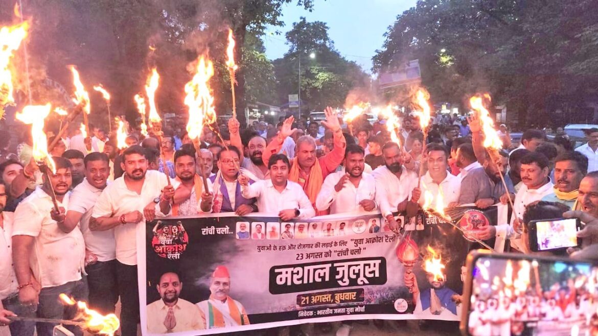 जमशेदपुर : BJYM Jamshedpur Metropolitan Took Torch Procession : भाजयुमो, जमशेदपुर महानगर ने बुधवार को साकची में मशाल जुलूस निकाला, जिसमें कार्यकर्ताओं ने जमकर नारेबाजी की। इसके साथ ही 23 अगस्त को भाजयुमो, झारखंड प्रदेश के नेतृत्व में रांची के मोरहाबादी मैदान में युवा आक्रोश रैली का आह्वान किया गया।