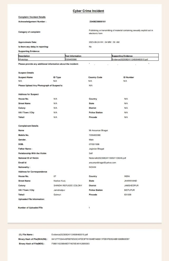 उन्होंने उनके साथ हुए इस अश्लील घटना की साइबर क्राइम इंसिडेंट में कम्प्लेंट कर दिया है जिसकी कॉपी हमे प्राप्त हुई है Acknowledgement Number : 23408230006161