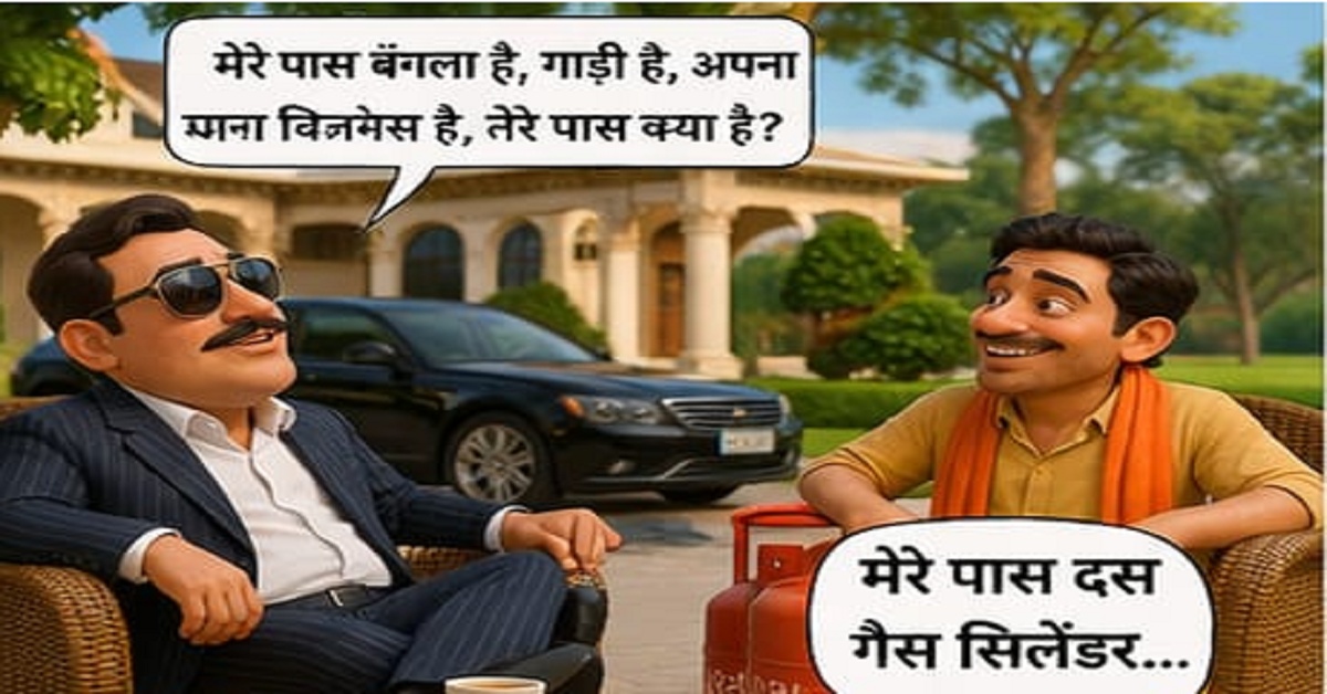 उसकी ठसक देख राजेश्वर लाल पूछ बैठते हैं …यार, मेरे पास बंगला, गाड़ी, बिजनेस – सब है, फिर मेरा इतना कॉल नहीं आता। तुम्हारे पास ऐसा क्या है कि अभी बड़े-बड़े अधिकारियों को भी होल्ड पर रख दे रहे हो। मंगला तपाक से जवाब देता है – मेरे पास 10 गैस सिलेंडर है। यह ऐसा पावर है जो कई घरों का चूल्हा बुझा सकता है… जला सकता है या 25 दोनों तक का इंतजार करा सकता है।