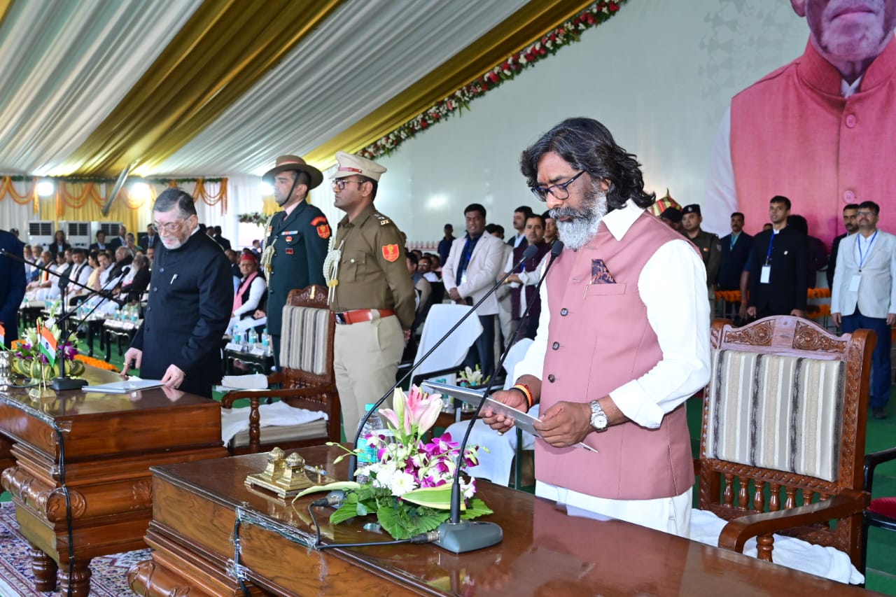 रांची: यह किसी मेगा शो से कम नहीं था। झारखंड विधानसभा चुनाव में सहयोगी दलों के साथ झारखंड मुक्ति मोर्चा की प्रचंड जीत के बाद गुरुवार को राजधानी के मोरहाबादी मैदान में शपथ ग्रहण समारोह का भव्य आयोजन किया गया। सुबह से ही राजनीतिक गणमान्य हस्तियों व सेलेब्रिटीज का आना शुरू हो गया था। राजधानी के बिरसा मुंडा एयरपोर्ट से उनका भव्य स्वागत किया जाता रहा। शाम चार बजे से शुरू हुए मुख्य कार्यक्रम में मोरहाबादी मैदान में बने भव्य पंडाल में मुख्यमंत्री पद के लिए हेमंत सोरेन ने शपथ ली। राज्यपाल संतोष कुमार गंगवार ने उन्हें पद व गोपनीयता की शपथ दिलाई। पूरा मोरहाबादी मैदान मुख्यमंत्री हेमंत सोरेन की जय के नारों से गूंज उठा।