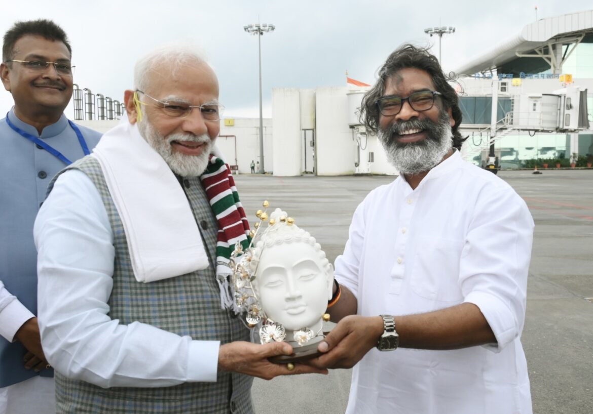 जमशेदपुर: जमशेदपुर के कार्यक्रम में शामिल होकर वापस रांची लौटने के बाद मुख्यमंत्री हेमंत सोरेन ने पीएम नरेंद्र मोदी का रांची एयपोर्ट पर स्वागत किया। इस दौरान हेमंत सोरेन ने प्रधानमंत्री को उपहार भेंट के रूप में बुद्ध की मूर्ति दी. प्रधानमंत्री नरेंद्र मोदी जमशेदपुर में जनसभा को संबोधित करने के बाद वापस रांची एयरपोर्ट पहुंचे तो यहां पर मुख्यमंत्री हेमंत सोरेन मौजूद थे। उन्होंने गर्मजोशी के साथ प्रधानमंत्री का स्वागत किया।