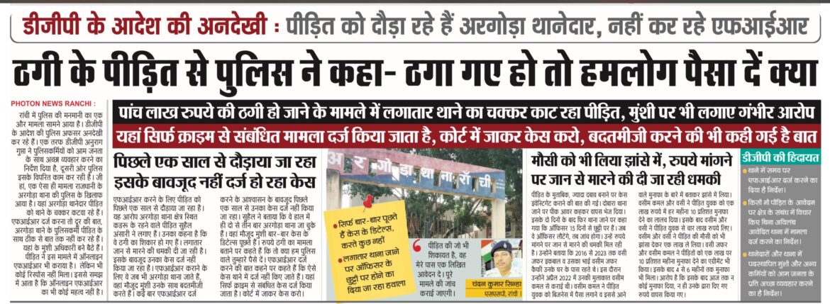 बता दें कि पीड़ित पिछले एक साल से अरगोड़ा थाना का चक्कर लगा रहा था। थाने में मौजूद पुलिस पीड़ित के साथ दुर्व्यवहार कर रहे थे। ‘द फोटोन न्यूज’ ने इस मुद्दे को उठाया था। 09 फरवरी के अंक में प्रमुखता से खबर प्रकाशित की गई थी। इसके बाद रांची एसएसपी ने मामले को संज्ञान में लिया। एसएसपी ने कहा था कि पूरे मामले की जांच कर कार्रवाई की जाएगी। अरगोड़ा पुलिस के रवैए से परेशान होकर पीड़ित ने रांची एसएसपी चंदन कुमार सिन्हा से भी गुहार लगाई थी।