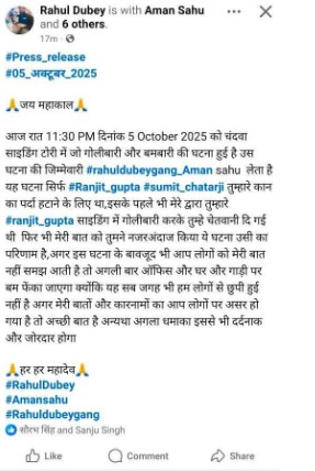 डोरंडा इलाके में फायरिंग की घटना के बाद राहुल दुबे गैंग ने 24 घंटे के अंदर चंदवा साइडिंग टोरी में गोलीबारी की घटना को अंजाम दिया। इस घटना की जिम्मेदारी लेते हुए उसने फेसबुक पोस्ट लिखा- यह घटना सिर्फ रंजीत गुप्ता और सुमित चटर्जी के कान का पर्दा हटाने के लिए थी। इससे पहले भी रंजीत गुप्ता साइडिंग में गोलीबारी करके चेतावनी दी गई थी, फिर भी उसकी बातों को नजरअंदाज किया गया, यह घटना उसी का परिणाम है। राहुल ने चेतावनी दी कि अगर इस घटना के बावजूद भी बात उसकी समझ में नहीं आती तो अगली बार ऑफिस, घर और गाड़ी पर बम फेंका जाएगा। ये सभी जगह उससे छिपी हुई नहीं है। अगर बात समझ नहीं आती तो अगली बार इससे भी दर्दनाक और जोरदार धमाके होंगे।