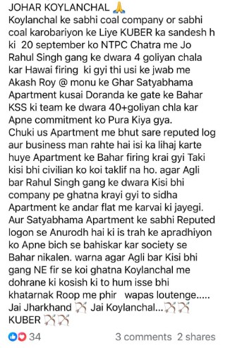 घटना को अंजाम देने के बाद केएसएस ने फेसबुक पोस्ट में लिखा- कोयलांचल के सभी कोल कारोबारियों को कुबेर का संदेश है कि गत 20 सितंबर को एनटीपीसी चतरा में राहुल सिंह गैंग के द्वारा 4 गोलियां हवा में चलाई गई थीं, उसके जवाब में आकाश राय उर्फ मोनू के घर सत्यभामा अपार्टमेंट के गेट के बाहर केएसएस टीम के द्वारा 40 से ज्यादा गोलियां चलाकर अपने कमिटमेंट को पूरा किया।