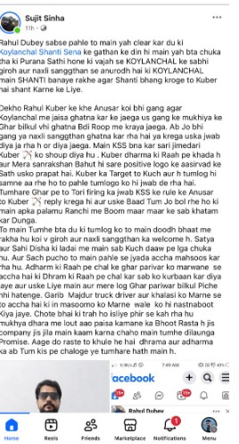 इस पोस्ट के ठीक कुछ देर के बाद कोयलांचल शांति सेना के फेसबुक आईडी से एक पोस्ट किया गया। इसमें लिखा गया कि राहुल दुबे तुम भले ही सुजीत भैया के आदमी हुआ करते थे मगर अब केएसएस की कमान मुझे सौंपी गई है। मैं किसी को छोड़ने वाला नहीं हूं। कोई भी कोयलांचल में अशांति फैलाएगा तो उसको मैं खत्म कर दूंगा।