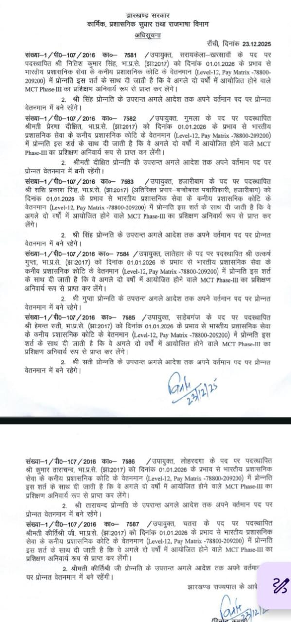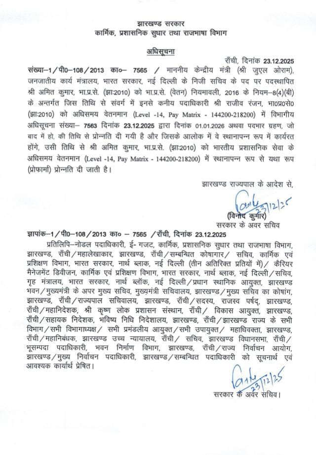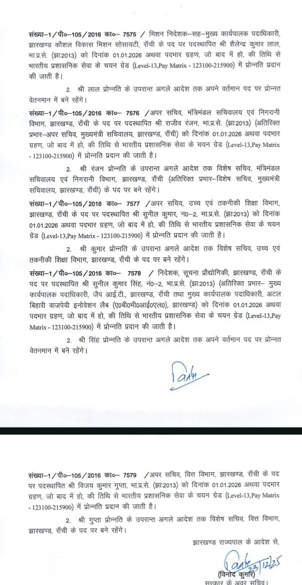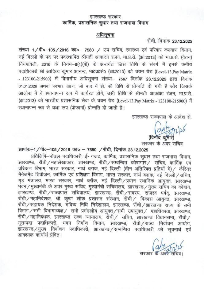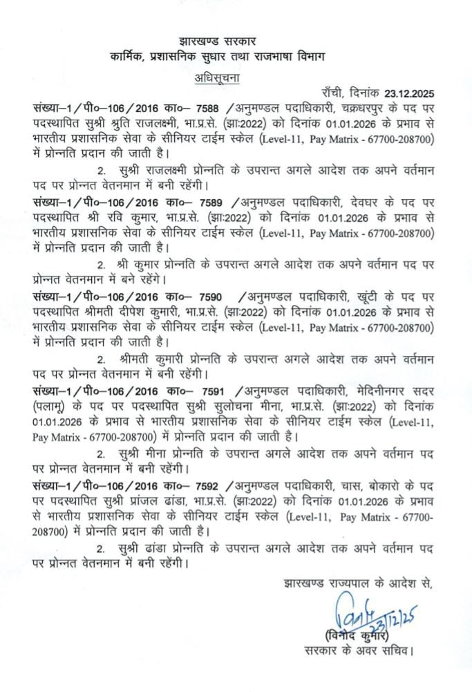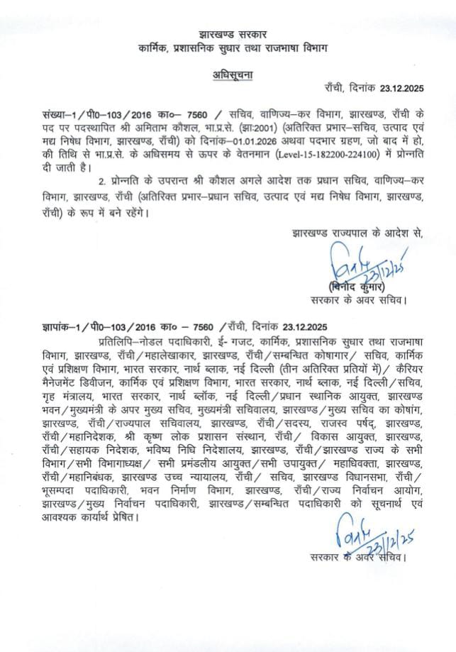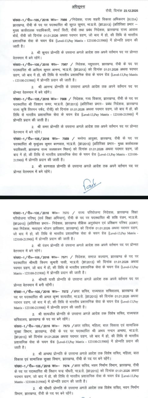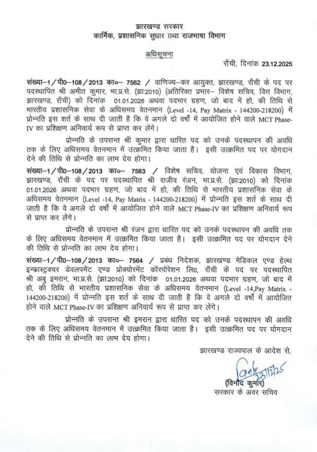RANCHI: झारखंड सरकार ने भारतीय प्रशासनिक सेवा के 34 अधिकारियों को अलग-अलग लेवल पर प्रोन्नति दी गई है। इसमें ग्रेड-11 से ग्रेड-17 तक के अफसरों को प्रोन्नति मिली है। कार्मिक विभाग ने इससे संबंधित अधिसूचना जारी कर दी है। एक पदाधिकारी वाणिज्य कर विभाग के सचिव अमिताभ कौशल को प्रधान सचिव (लेवल 15) में प्रोन्नति मिली है। लेवल 17 में मस्त राम मीना और वंदना डाडेल को मुख्य सचिव के वेतनमान में प्रमोशन दिया गया है। 7 उपायुक्तों और 5 अनुमंडल पदाधिकारी को भी प्रोन्नति दी गई है। सचिव (लेवल 14) में अमीत कुमार, राजीव रंजन, अबु इमरान, अमित कुमार को में प्रोन्नति दी गई है। विशेष सचिव (लेवल 13) में सूरज कुमार, आदित्य कुमार आनंद, जिशान कमर, मृत्युंजय बर्णवाल, शशि रंजन, किरण कुमारी पासी, अमल कृष्ण सत्यजीत, अभय नंदन अम्बष्ठ, विधान चंद्र चौधरी, शैलेंद्र कुमार लाल, राजीव रंजन, सुनील कुमार (2), सुनील कुमार सिंह (2), विजय कुमार गुप्ता, आकांक्षा रंजन को प्रोन्नति दी गई है।