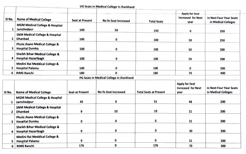 RANCHI: झारखंड सरकार ने राज्य में मेडिकल एजुकेशन को मजबूत करने और विशेषज्ञ डॉक्टरों की कमी दूर करने के उद्देश्य से मेडिकल कॉलेजों में अंडर ग्रेजुएट (यूजी) और पोस्ट ग्रेजुएट (पीजी) सीटों में बढ़ोतरी की दिशा में महत्वपूर्ण कदम उठाया है। राज्य सरकार द्वारा विभिन्न मेडिकल कॉलेजों में सीट बढ़ाने का प्रस्ताव नेशनल मेडिकल काउंसिल को भेजा गया है। सरकार की इस पहल के तहत जमशेदपुर स्थित एमजीएम मेडिकल कॉलेज में यूजी सीटों की संख्या 100 से बढ़ाकर 150 कर दी गई है।