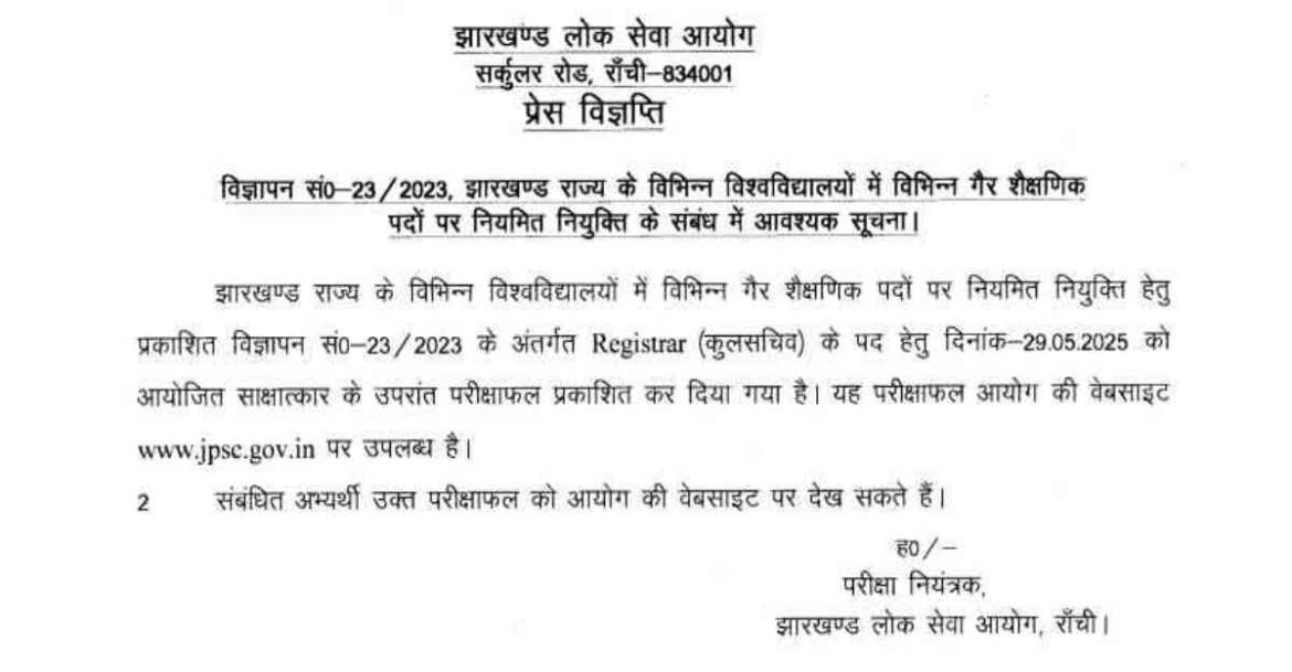 Jamshedpur / Ranchi (Jharkhand) : झारखंड के उच्च शिक्षा जगत के लिए एक बड़ी खबर सामने आई है। झारखंड लोक सेवा आयोग (JPSC) ने आखिरकार राज्य के सात विश्वविद्यालयों के लिए नए कुलसचिवों (Registrar) की नियुक्ति कर दी है। इन विश्वविद्यालयों में पिछले दो से तीन सालों से कुलसचिव के पद खाली थे, जिससे प्रशासनिक कार्यों में काफी दिक्कतें आ रही थीं। अब जेपीएससी ने 29 मई को आयोजित साक्षात्कार के आधार पर इन महत्वपूर्ण पदों पर नियुक्ति की घोषणा कर दी है।