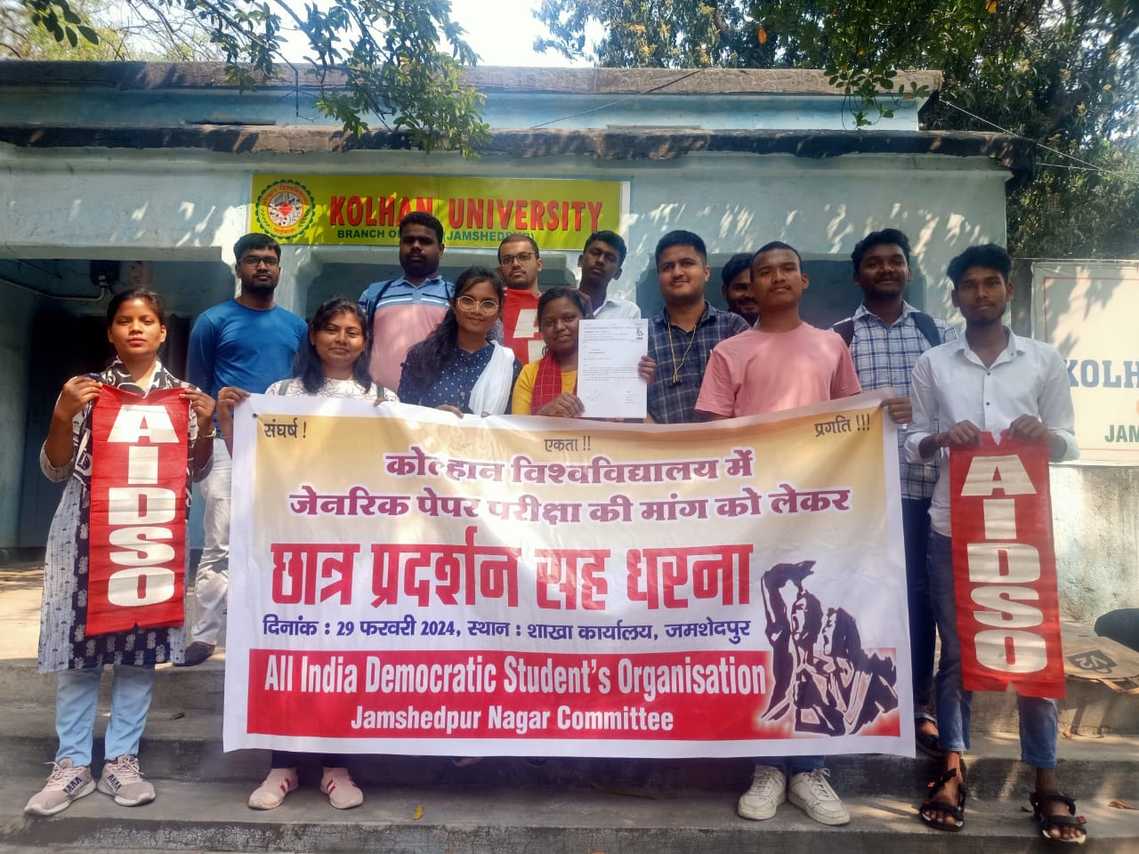 जमशेदपुर/Kolhan University Hungama :  ऑल इण्डिया डेमोक्रेटिक स्टूडेंट्स ऑर्गनाइजेशन जमशेदपुर नगर कमिटी के द्वारा कोल्हान विश्वविद्यालय में जेनेरिक पेपर की परीक्षा आयोजित करने की मांग को लेकर कोल्हान विश्वविद्यालय के शाखा कार्यालय में धरना प्रदर्शन किया गया। संगठन के नगर अध्यक्ष शुभम कुमार झा ने कहा कि कोल्हान विश्वविद्यालय में वर्ष 2017 से सेमेस्टर प्रणाली को लागू किया गया, उसके बाद से दो सब्सिडियरी पेपर की जगह केवल एक पेपर पढ़ाया गया और परीक्षा भी ली गई।
