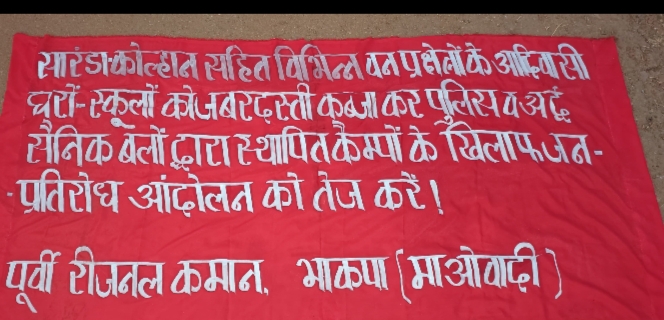 इस नक्सली संगठन के पूर्वी रीजनल कमान द्वारा जारी बैनरों और पोस्टरों में सारंडा समेत विभिन्न वन क्षेत्रों के आदिवासी घरों, स्कूलों पर जबरदस्ती कब्जा कर पुलिस और अर्द्ध सैनिक बलों द्वारा स्थापित कैंपों के खिलाफ जनप्रतिरोध आंदोलन को तेज करने एवं केंद्र सरकार के वन संरक्षण कानून-2020, 22, 23 के खिलाफ जल, जंगल, जमीन पर जनता का अधिकार कायम करने के लिए जन आंदोलन का निर्माण करने और तेज करने जैसी बातें लिखी गई हैं।