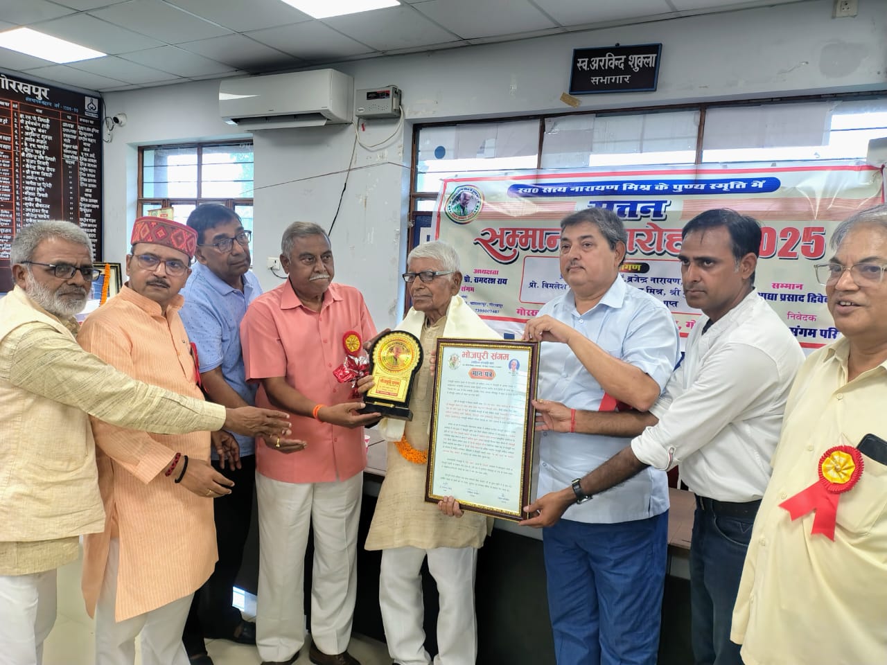गोरखपुर : स्वर्गीय सत्य नारायण मिश्र ‘सत्तन’ की पुण्य स्मृति में साहित्यिक संस्था भोजपुरी संगम की ओर से आयोजित समारोह में वरिष्ठ साहित्यकार डॉ. आद्या प्रसाद द्विवेदी को सत्तन सम्मान 2025 से सम्मानित किया गया। यह आयोजन गोरखपुर के प्रेस क्लब सभागार में किया गया, जिसकी अध्यक्षता प्रो. रामदरश राय ने की और संचालन डॉ. फूलचंद प्रसाद गुप्त ने किया।