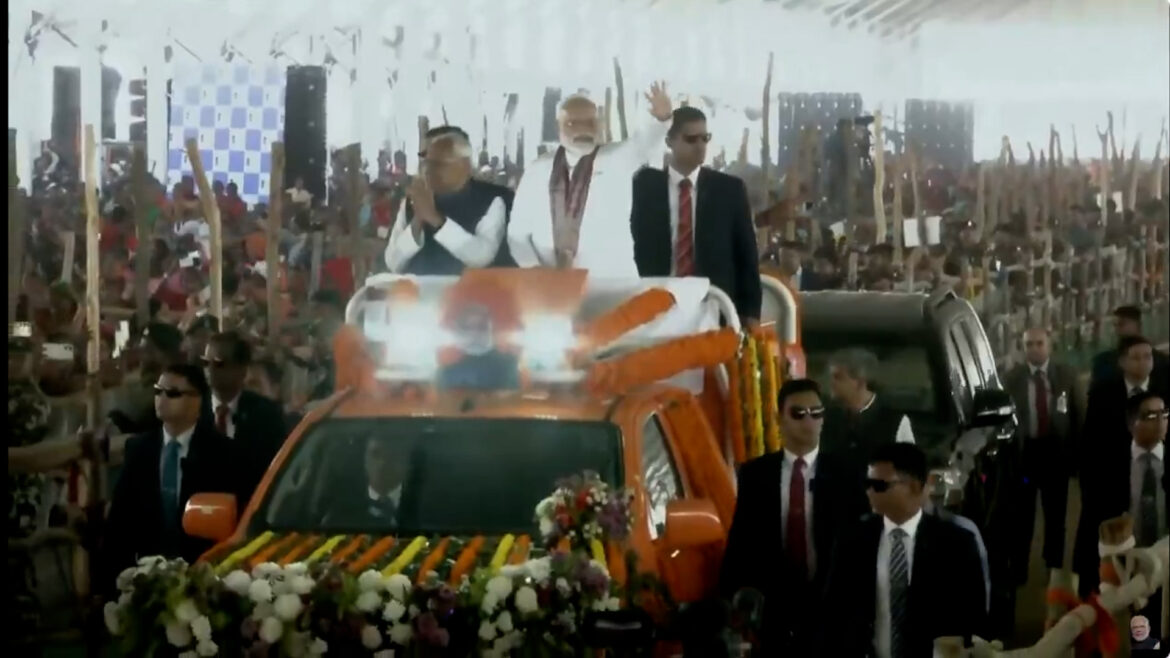 भागलपुर हेलीपैड से कार्यक्रम स्थल तक का सफर कुछ सौ मीटर का था, जहां प्रधानमंत्री मोदी और मुख्यमंत्री नीतीश कुमार ने फूलों से सजे खुले वाहन में बैठकर रोड शो किया। इस दौरान मोदी ने वहां मौजूद उत्साही भीड़ का अभिवादन किया और उनके द्वारा लगाए जा रहे नारे का जवाब हाथ हिलाकर दिया।