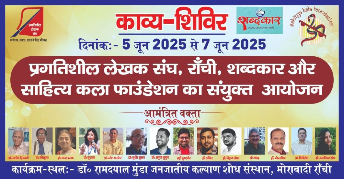 Ranchi (Jharkhand) : झारखंड की राजधानी रांची में प्रगतिशील लेखक संघ, शब्दकार और साहित्य कला फाउंडेशन के संयुक्त तत्वावधान में तीन दिवसीय काव्य शिविर का आयोजन किया गया है। यह शिविर गुरुवार से यानी 5 जून से मोराबादी स्थित डॉ. रामदयाल मुंडा जनजातीय कल्याण शोध संस्थान में शुरू होगा।