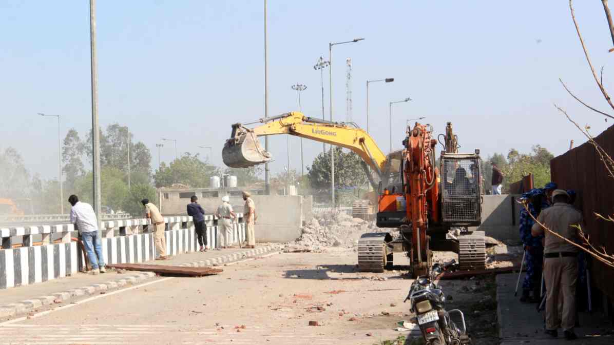 हरियाणा पुलिस भी अपनी सीमा में किसानों को रोकने के लिए लगाए गए भारी सीमेंट बैरिकेड को तोड़ रही है, ताकि रास्ता साफ हो सके।