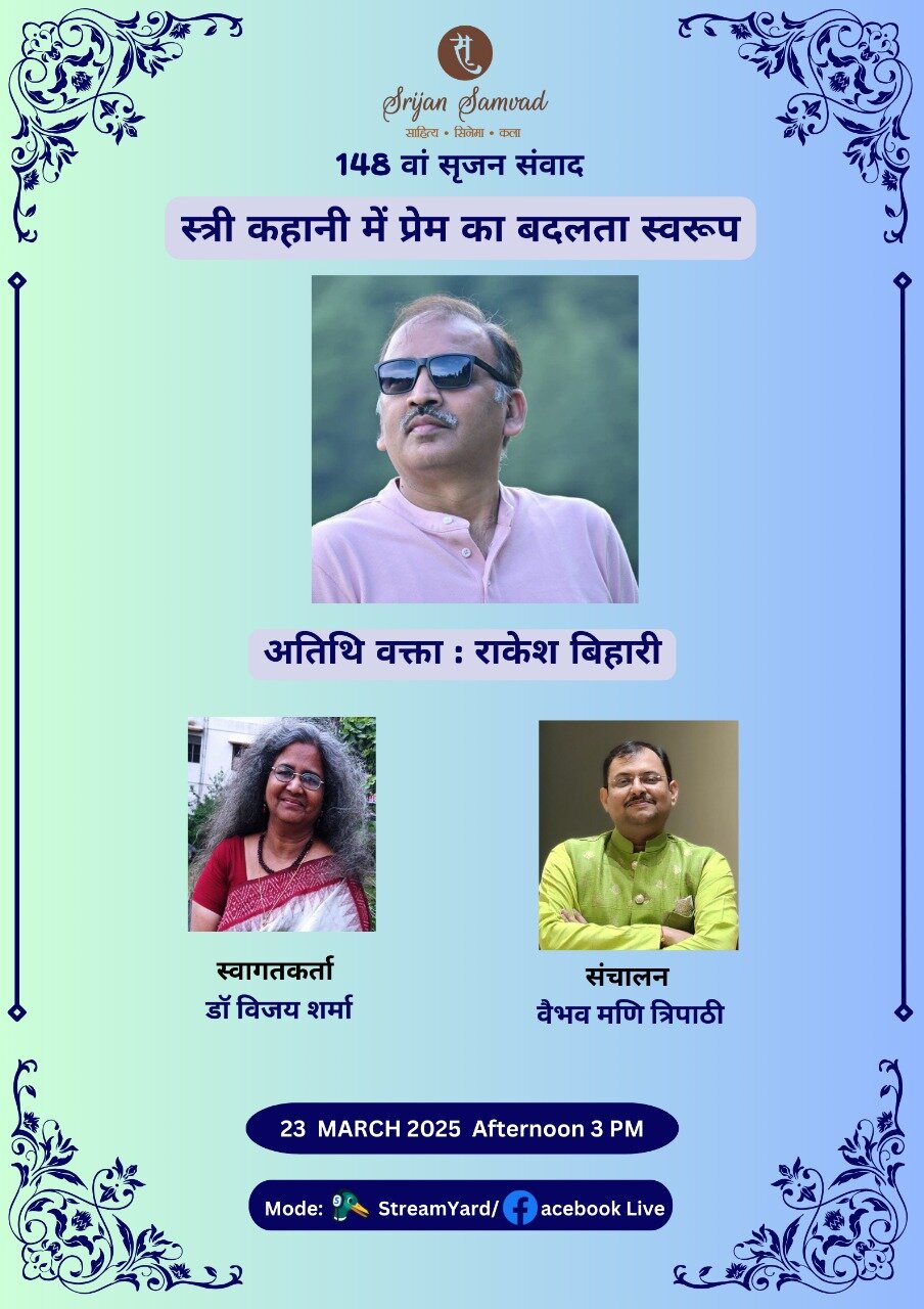 जमशेदपुर : ‘सृजन संवाद’ साहित्य, सिनेमा एवं कला की संस्था ने 148वीं संगोष्ठी स्ट्रीमयार्ड तथा फ़ेसबुक लाइव द्वारा विषय पर चर्चा का आयोजन किया। रविवार को इस कार्यक्रम में मुख्य वक्ता के रूप आलोचक-कहानीकार राकेश बिहारी इलाहाबाद से उपस्थित थे। स्वागत-धन्यवाद ज्ञापन डॉ. विजय शर्मा ने दिया। कार्यक्रम का संचालन वैभव मणि त्रिपाठी ने किया।