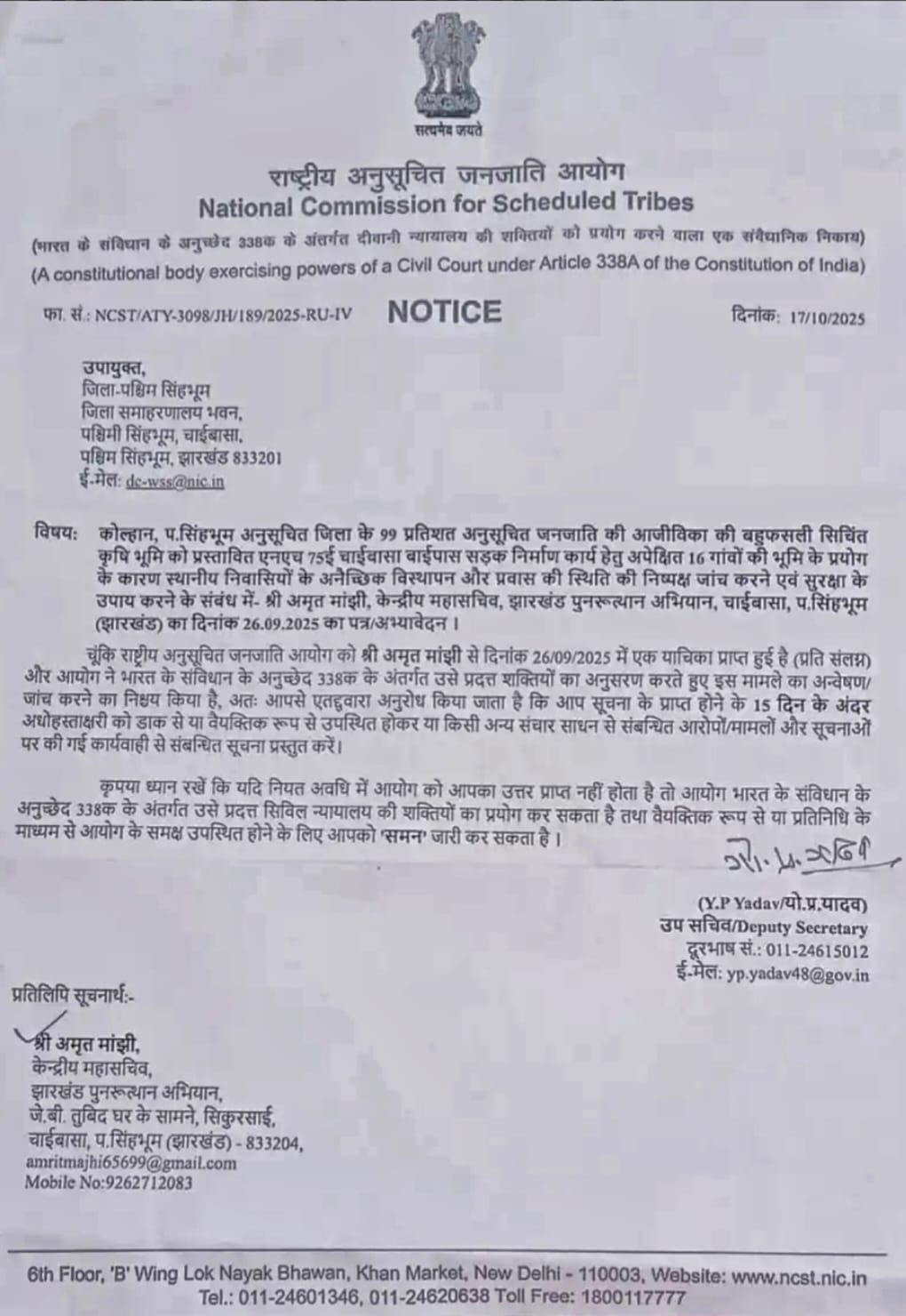 चाईबासा : राष्ट्रीय अनुसूचित जनजाति आयोग ने पश्चिमी सिंहभूम जिले में आदिवासी जमीन पर बिना अनुमति सड़क निर्माण के मामले में कड़ा रुख अपनाया है। आयोग ने जिला प्रशासन से 15 दिनों के भीतर जवाब मांगा है।17 अक्टूबर 2025 को जारी नोटिस में आयोग ने कहा कि कोल्हान, पश्चिमी सिंहभूम जैसे 99 प्रतिशत अनुसूचित जनजाति बहुल जिले में आदिवासियों की जमीन का उपयोग बिना अनुमति के करना गंभीर मामला है।