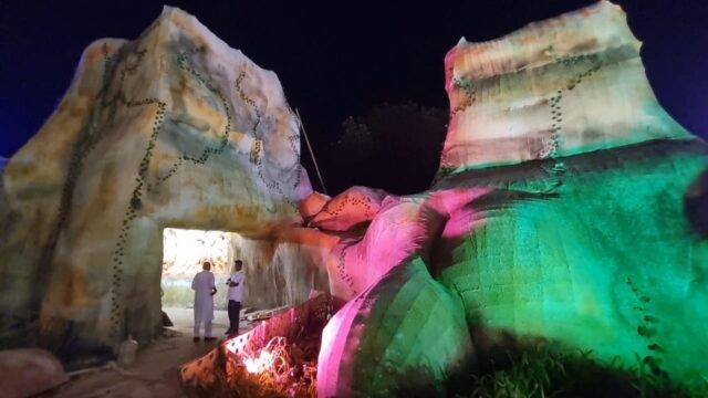 करीब 50 लाख रुपए की लागत से बनकर तैयार हुए इस पूजा पंडाल की रौनक देखने लायक है। इसमें एक मुख्य मंदिर के साथ गुफानुमा दो अन्य मंदिर हैं। इसमें मां दुर्गा की तीन प्रतिमाएं स्थापित की गयी हैं जो बेहतर खुबसूरत हैं।