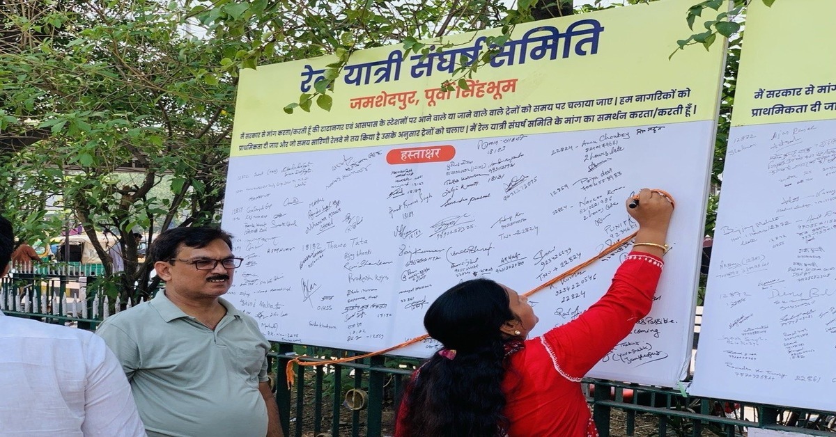 Jamshedpur : भीषण गर्मी और लगातार लेट हो रही ट्रेनों के खिलाफ रविवार को टाटानगर स्टेशन परिसर में रेल यात्री संघर्ष समिति की ओर से हस्ताक्षर अभियान चलाया गया। इस अभियान की शुरुआत जमशेदपुर पश्चिम के विधायक सरयू राय ने खुद हस्ताक्षर कर की। इसके बाद बड़ी संख्या में यात्रियों ने व्हाइट बोर्ड और फॉर्म पर हस्ताक्षर कर अपना विरोध दर्ज कराया।