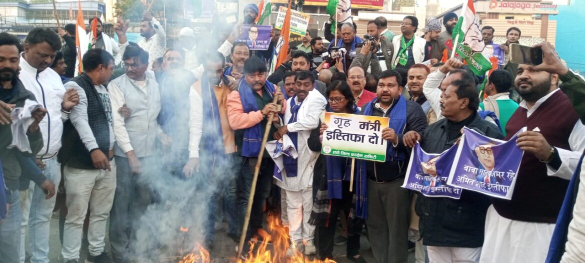 रांची : गुरुवार को केंद्रीय गृह मंत्री अमित शाह द्वारा 17 दिसंबर को राज्यसभा में बाबा साहब भीमराव आंबेडकर पर की गई टिप्पणी के विरोध में झारखंड प्रदेश कांग्रेस कमिटी ने विरोध मार्च निकाला। यह मार्च कांग्रेस भवन से अल्बर्ट एक्का चौक तक प्रदेश कांग्रेस अध्यक्ष केशव महतो कमलेश के नेतृत्व में निकाला गया। इस दौरान अमित शाह का पुतला दहन भी किया गया।