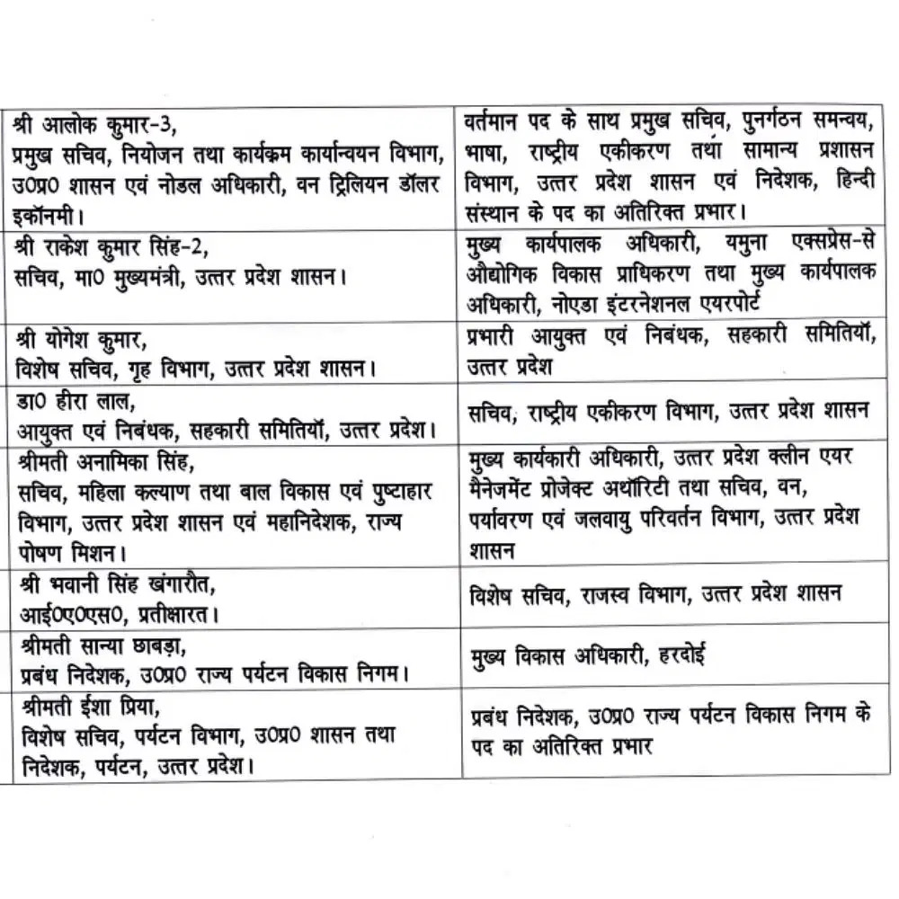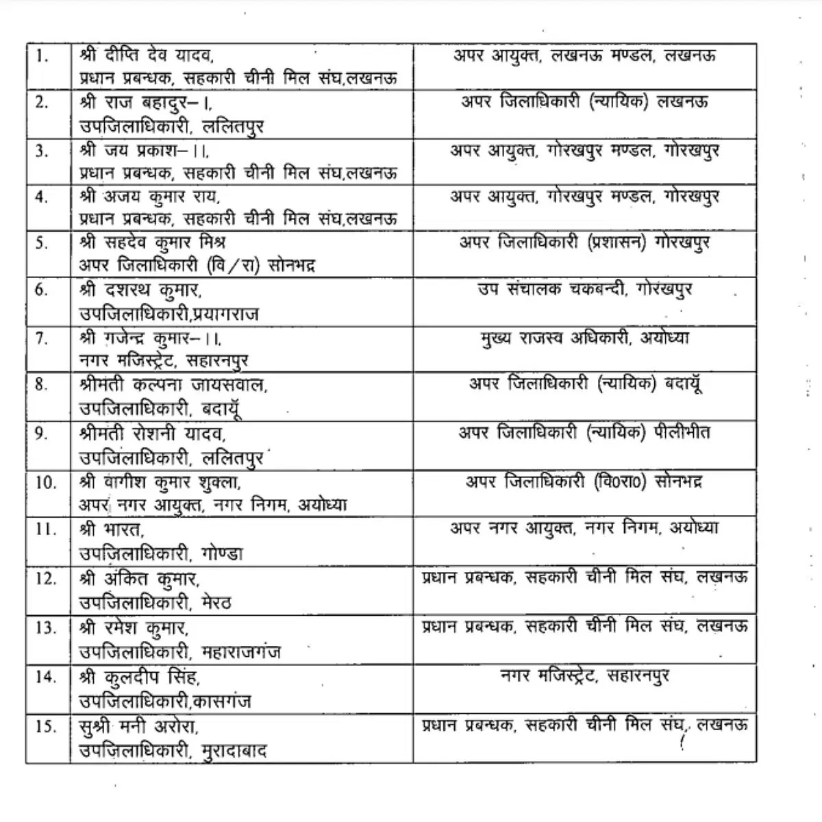 राज्य सरकार ने 15 PCS अधिकारियों का भी तबादला किया है। कुछ प्रमुख नाम और नई जिम्मेदारियां इस प्रकार हैं:
