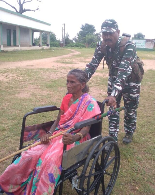 दिव्यांग महिला को मतदान बूथ तक ले जाते सुरक्षा